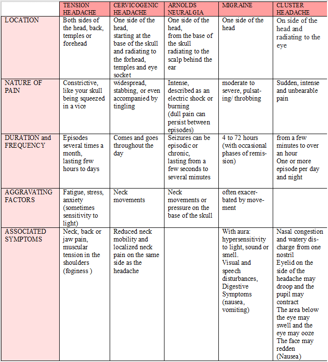 Here is a comparison table to differentiate between the most common types of headaches: